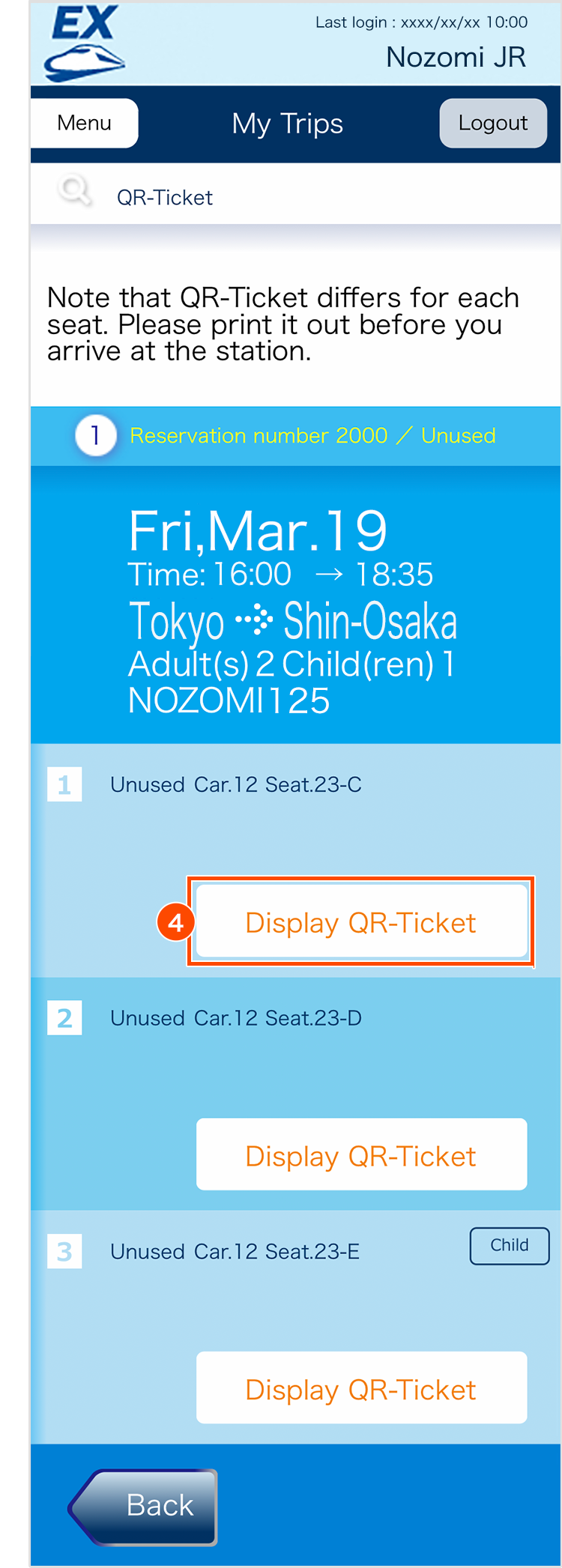 - Be sure to pick up "Seat Information" when using QR-Ticket to enter the ticket gate. If you do not have "Seat Information" with you, you will be subject to the basic fare and limited express ticket for the section and the facility used.