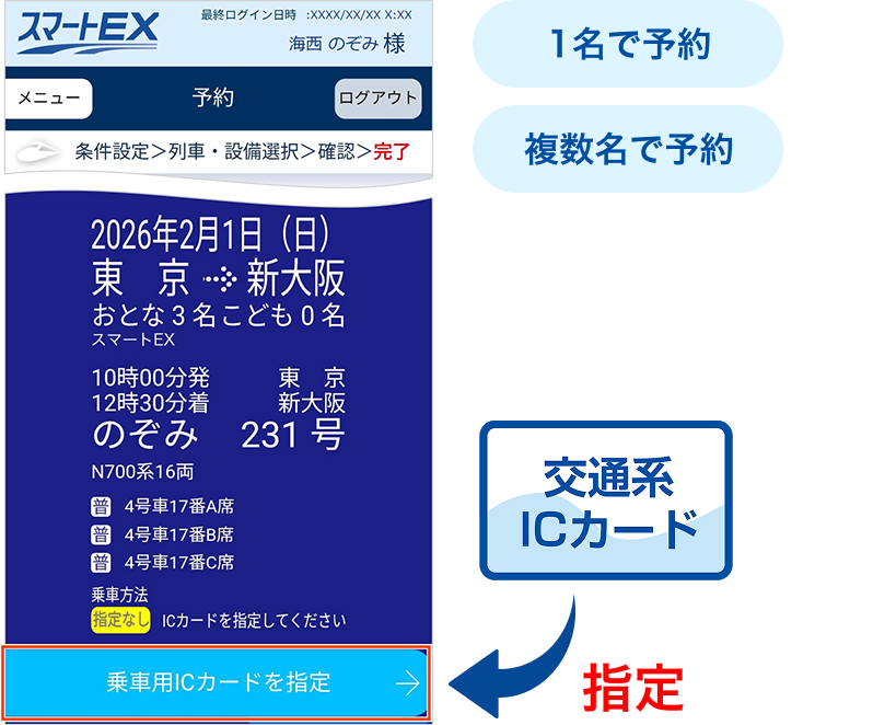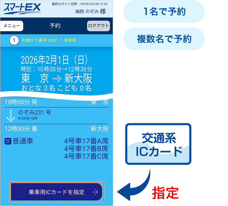 取り急ぎ席を先に確保し、後から交通系ICカードの番号を確認し、指定する場合