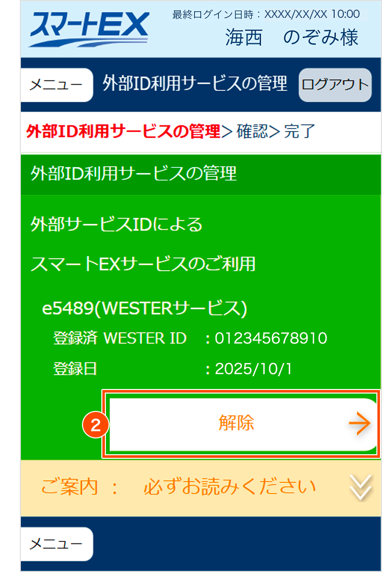 - 解除すると、外部IDでスマートEXにログインすることができなくなります。