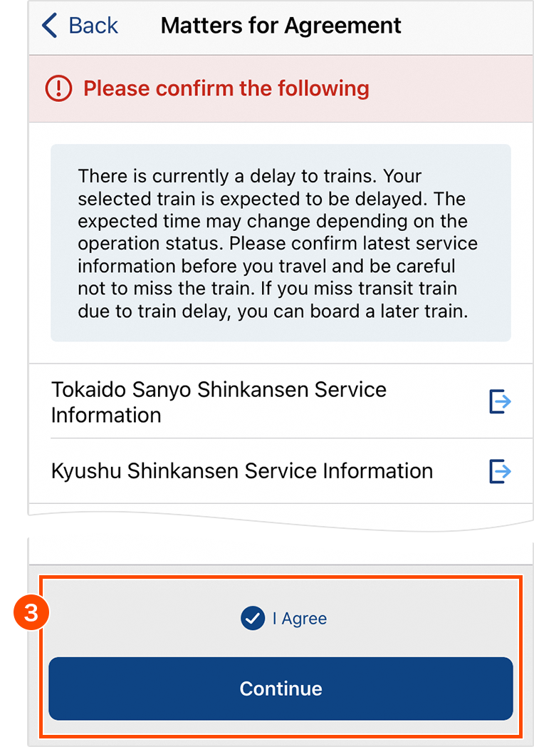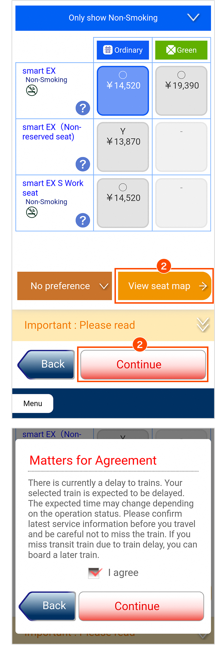 Select your preferred fare and facility. Confirm "Matters for Agreement" and put a check in "I agree" checkbox. Tap "Continue" or "View seat map".