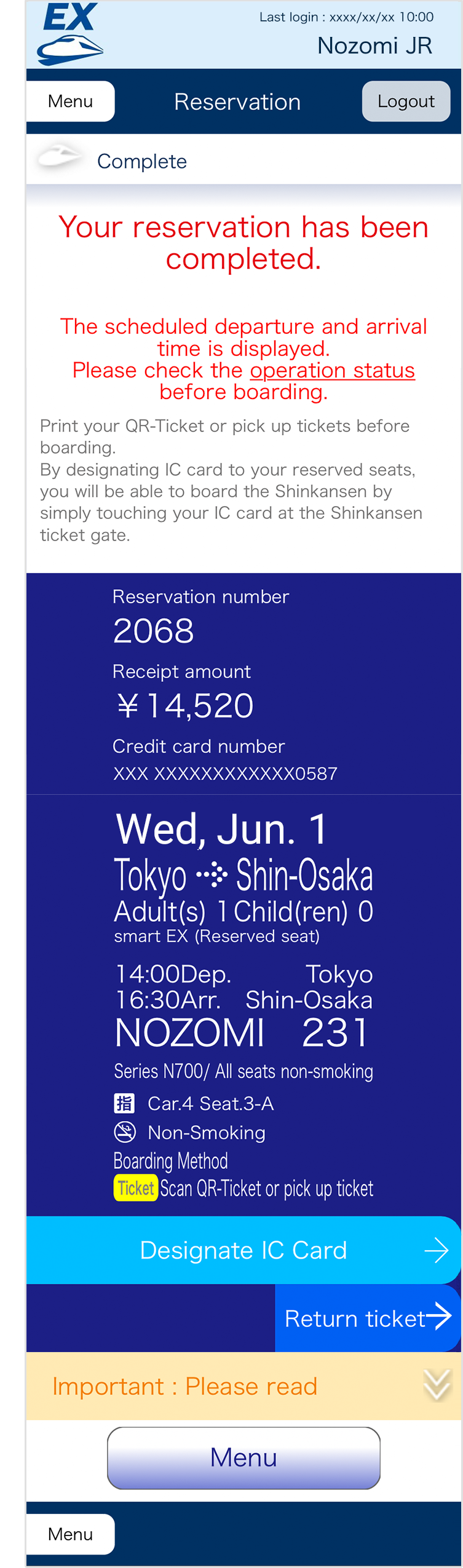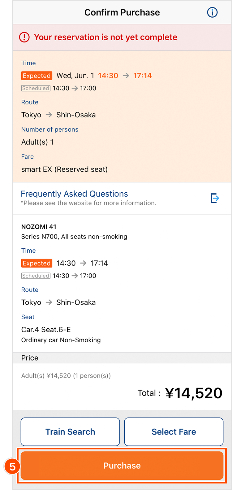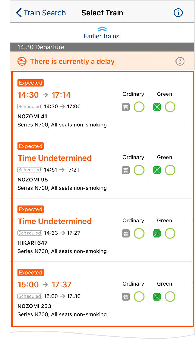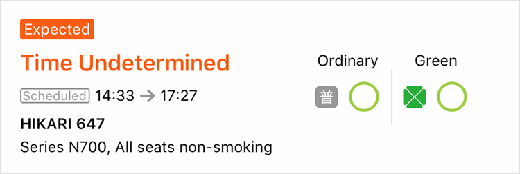 - If you have a reservation on the day of boarding, and your reserved trains is expected to be deleayd, expected departure and arrival time, and "Expected" mark will be displayed in orange letters.