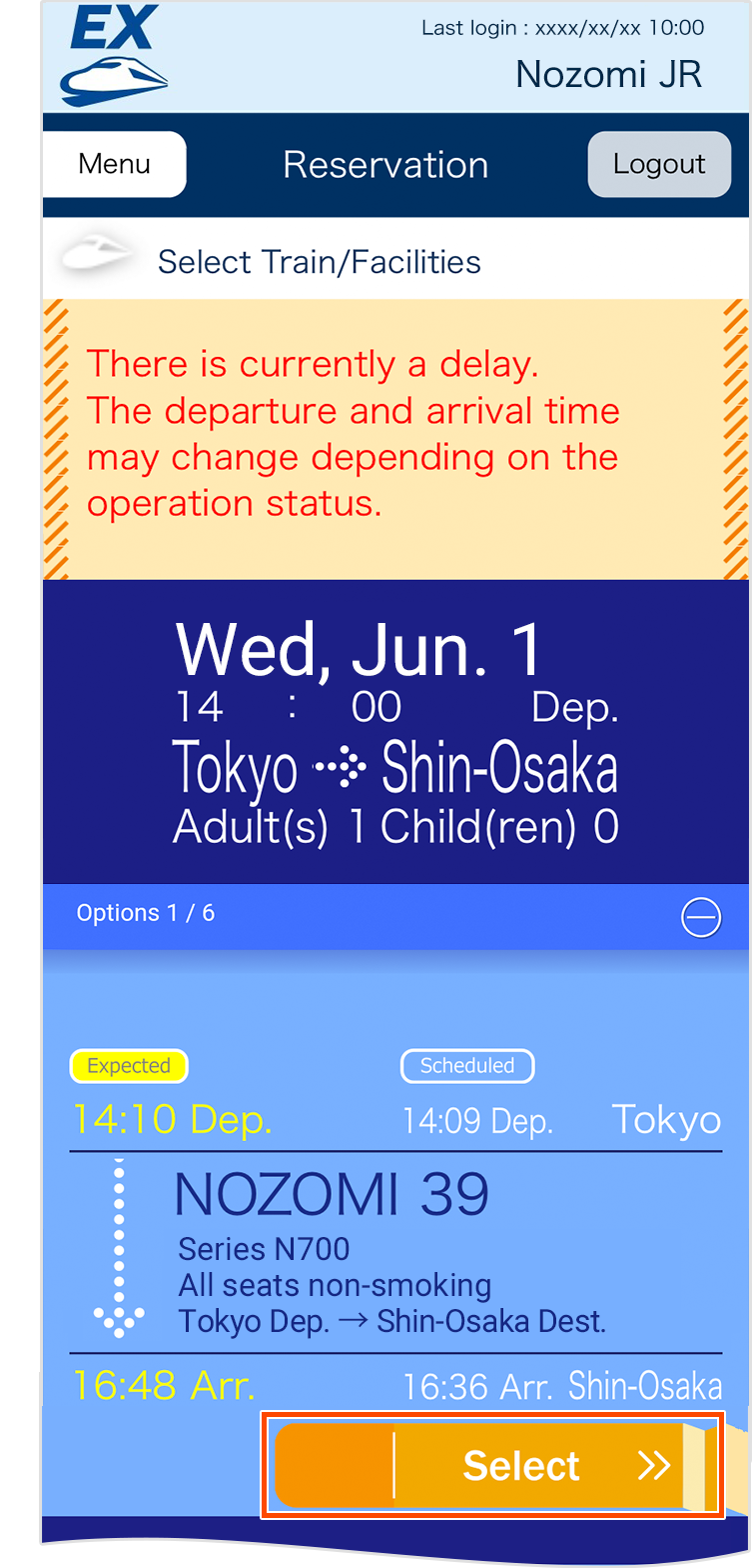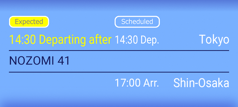 - If you have a reservation on the day of boarding, and your reserved train is expected to be deleayd, expected departure and arrival time, and "Expected" mark will be displayed in yellow letters.