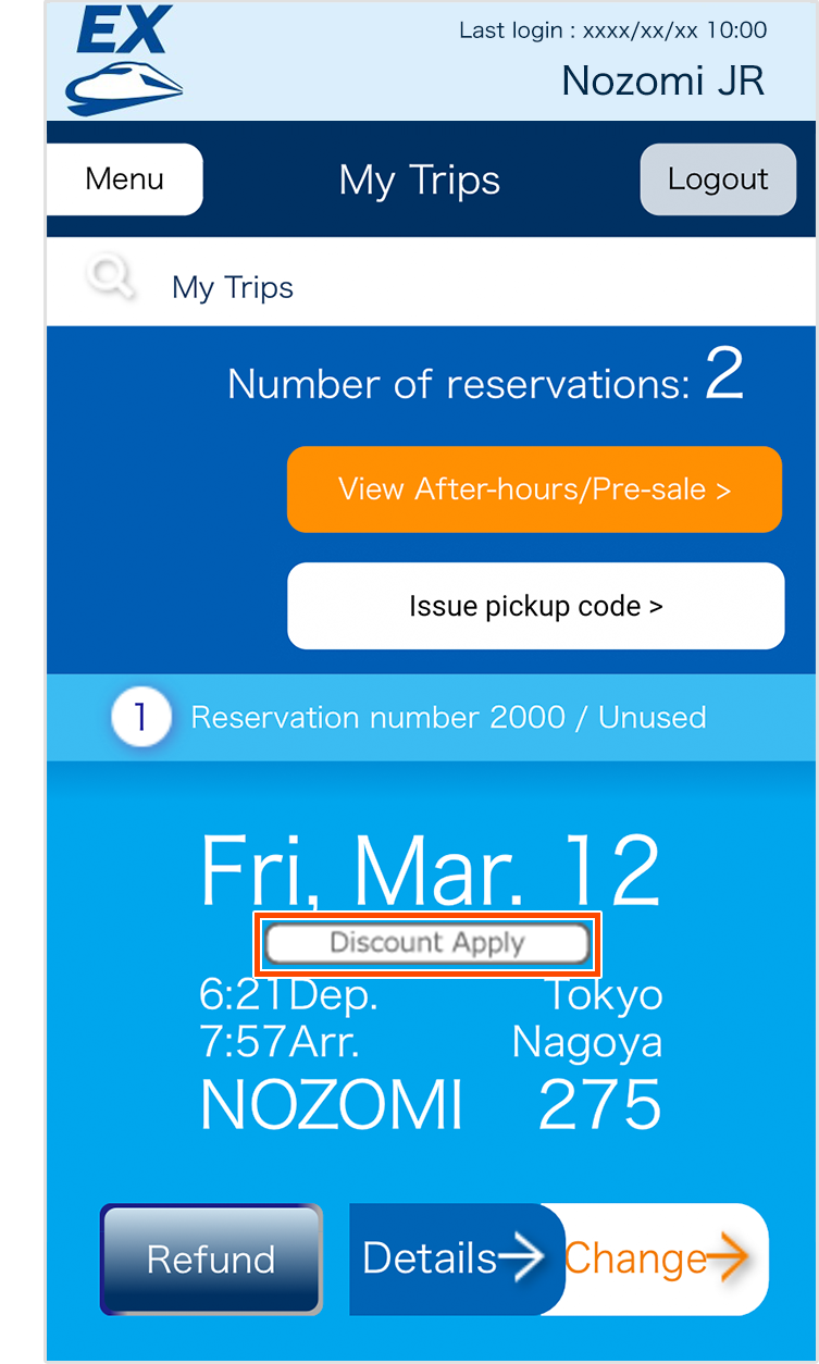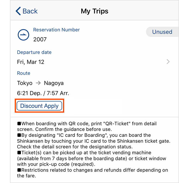 - If you have a reservation for "Hayatoku" fare and "Discount Apply" mark is displayed on My Trips/Details screen, discount conditions will be taken over when you make a changes to your reservation.