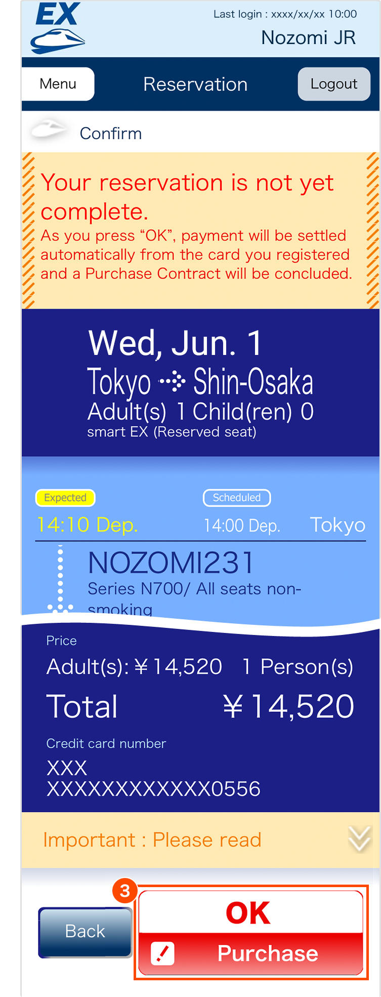 - The expected time on this screen is the time that was displayed on "Select Train and Facility" screen. Note that it is not the latest operation status.