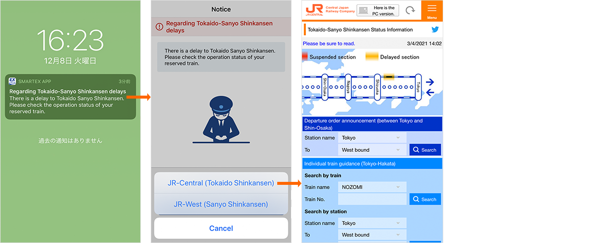 When your reservation was made from the EX App, if the train you reserved is expected to be delayed from its departure time for more than your setting time, you will receive a push notification according to your settings before the scheduled departure time of your reserved train.