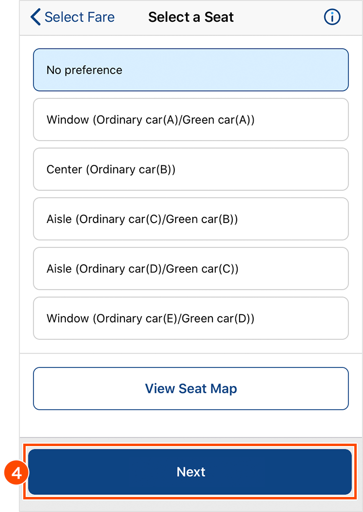 - Tap "View Seat Map" to select your preferred car and seat from the seat map.