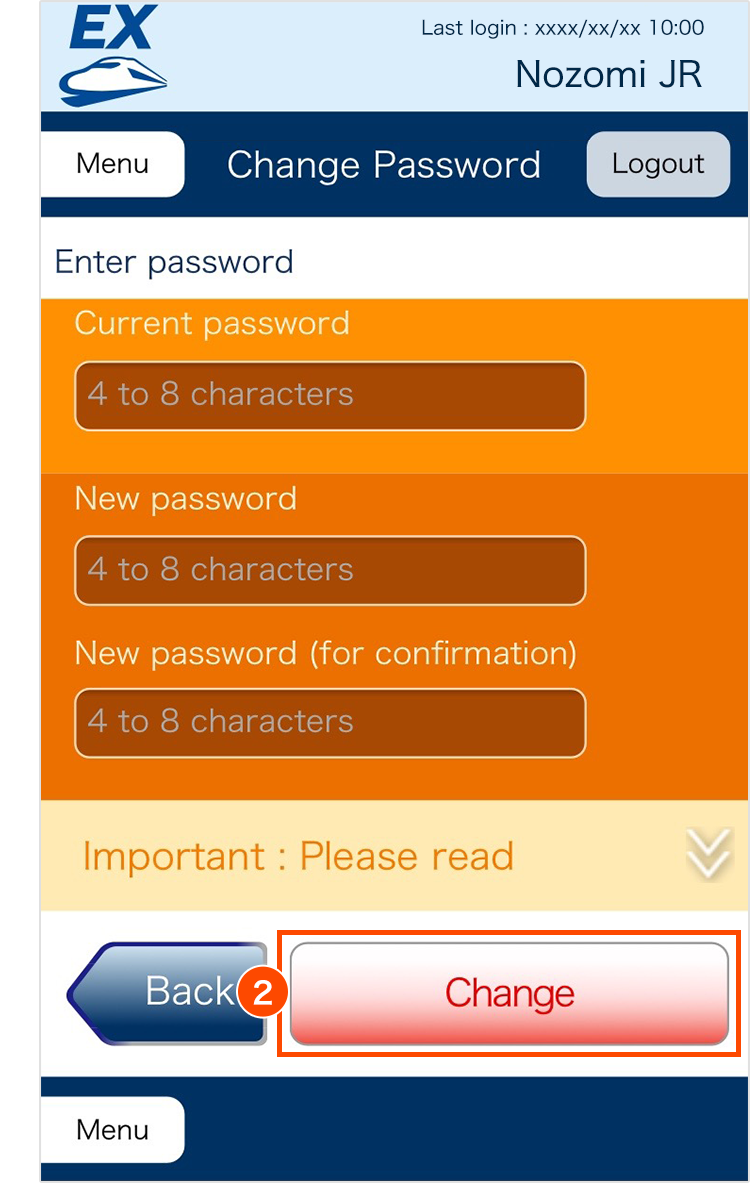 Shows how to change your login password. Be sure to register your password between 4-8 alphanumeric characters and symbols.