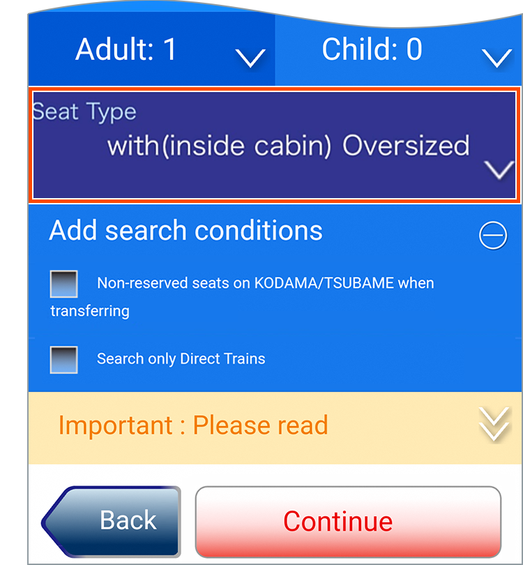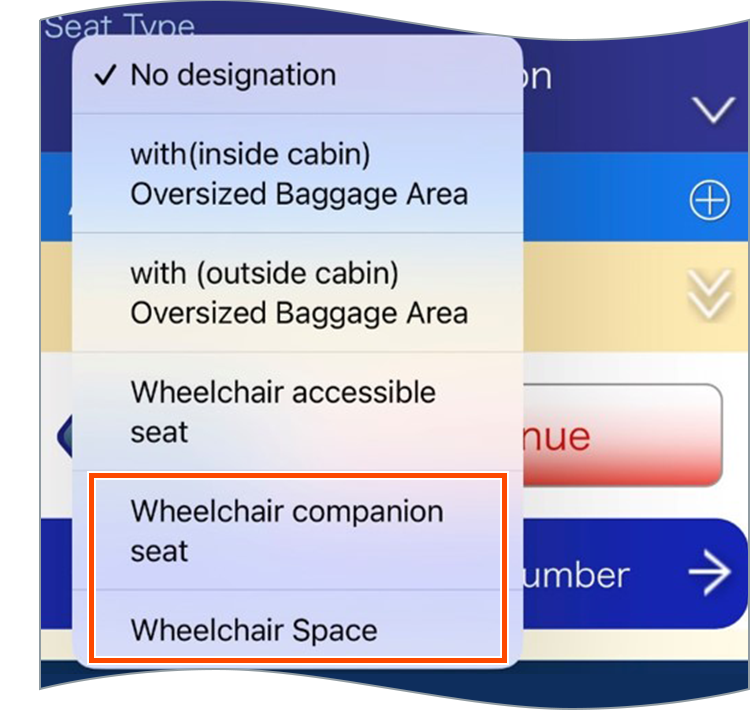 Please select your desired seat ("Wheelchair accessible seat", "Wheelchair companion seat" or "Wheelchair space") from【Seat Type】.
