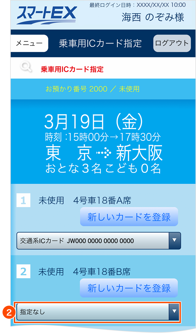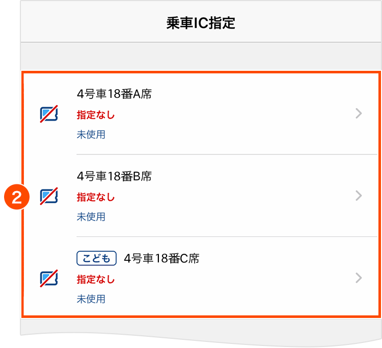 - 乗車用ICカードが指定されていない座席がある場合は、「指定なし」と表示されます。