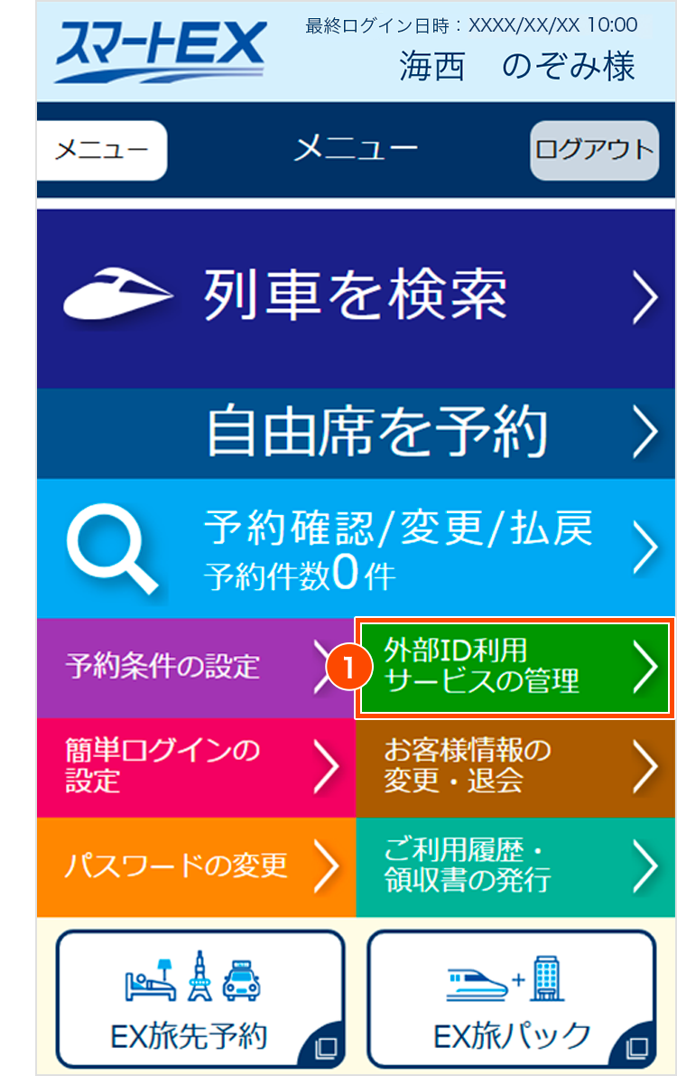 EXアプリをご利用の場合は、ログイン後の右上の「」アカウントメニューから「外部ID利用サービス」をタップしてください。