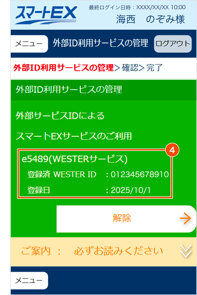 以降、紐づけ登録したWESTER IDでスマートEXをご利用いただけます。